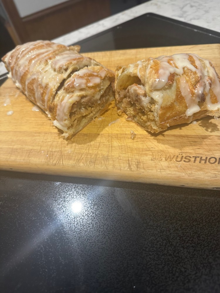 Using a spoon, drizzle the glaze over the cooled, but still warm Kringle