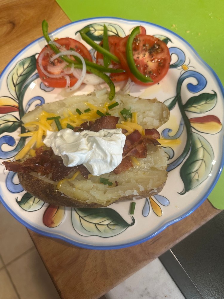 Add toppings of your choice (sour cream, cheddar cheese, bacon bits, chives, for example)