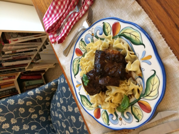 Nestle the short ribs into the sauce, pouring any juice from the bowl on top.