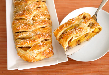 Starting at one end, fold the pastry strips over the peach mixture, alternating sides to cover the peach mixture