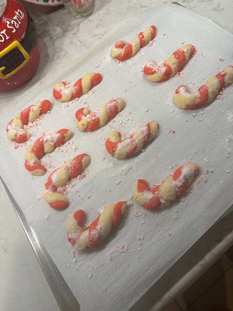 Transfer the dough to a prepared baking sheet and shape into a candy cane.