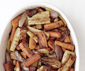 Add the carrots, parsnips, shallots, thyme sprigs, bacon, and 1 t salt;
