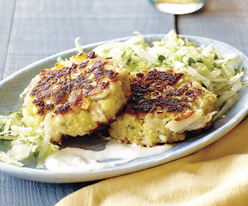 Combine the crab, panko, corn, and 1-1/2 tsp. salt in a large bowl.