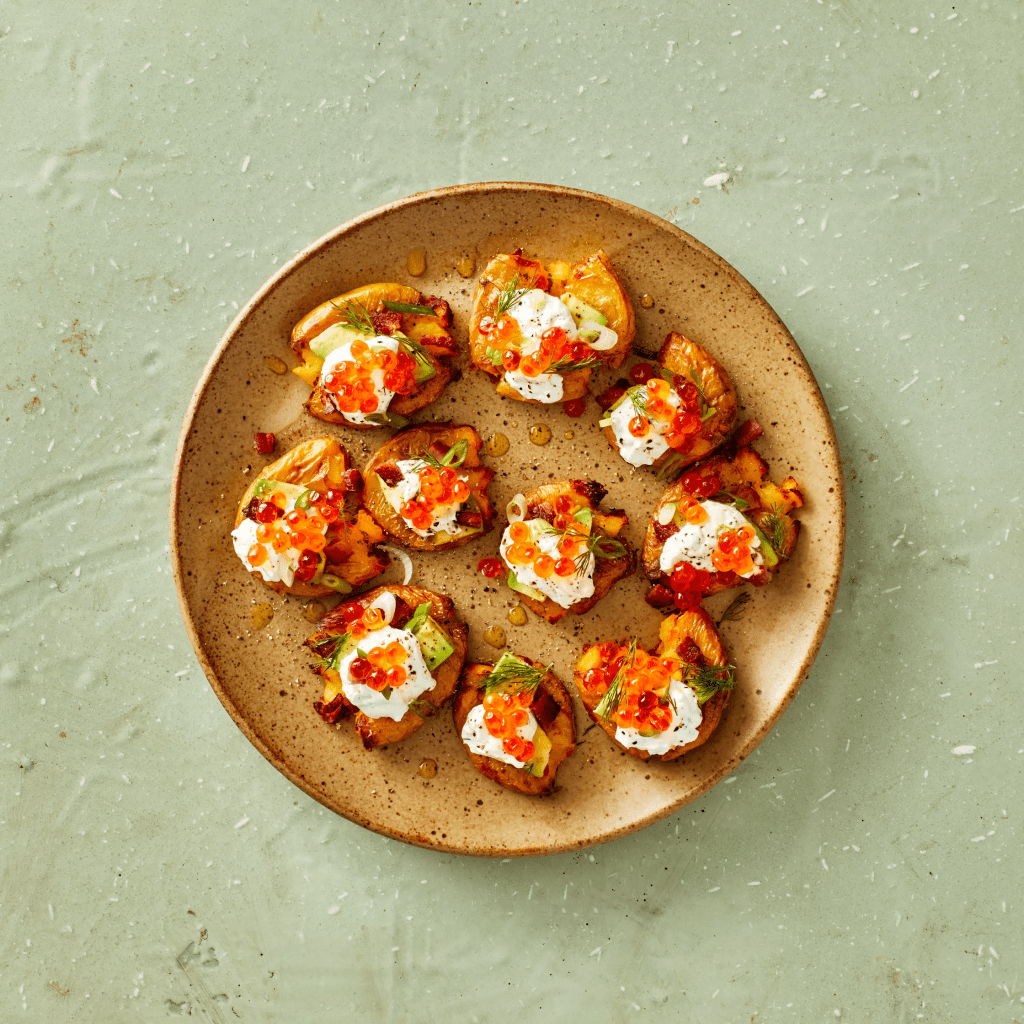 Top each with 1 avocado, sliced, cut into 1″ pieces, whipped goat cheese, some bacon and 1 scallion, thinly sliced, a healthy spoonful of caviar from one 1.75-oz. jar salmon caviar, preferably wild and smoked, and more herbs.