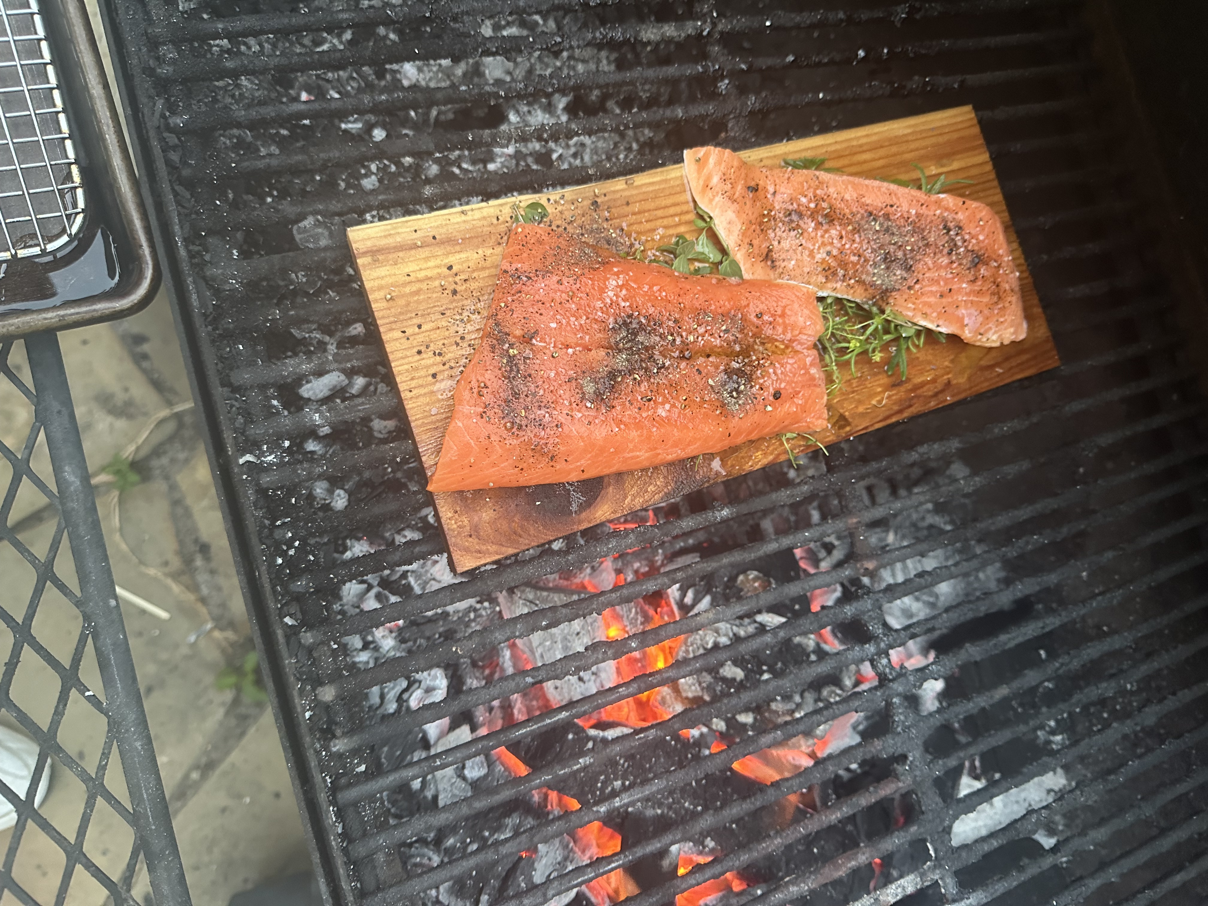 Immerse a cedar plank(I use untreated cedar fencing cut into about 12in pieces) in water for 60 minutes (30 minutes if you are behind)