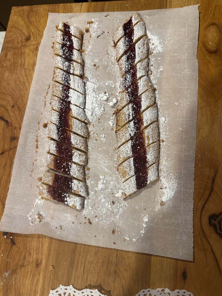 Use a bench scraper to cover the jam while you dust the sides with powdered sugar