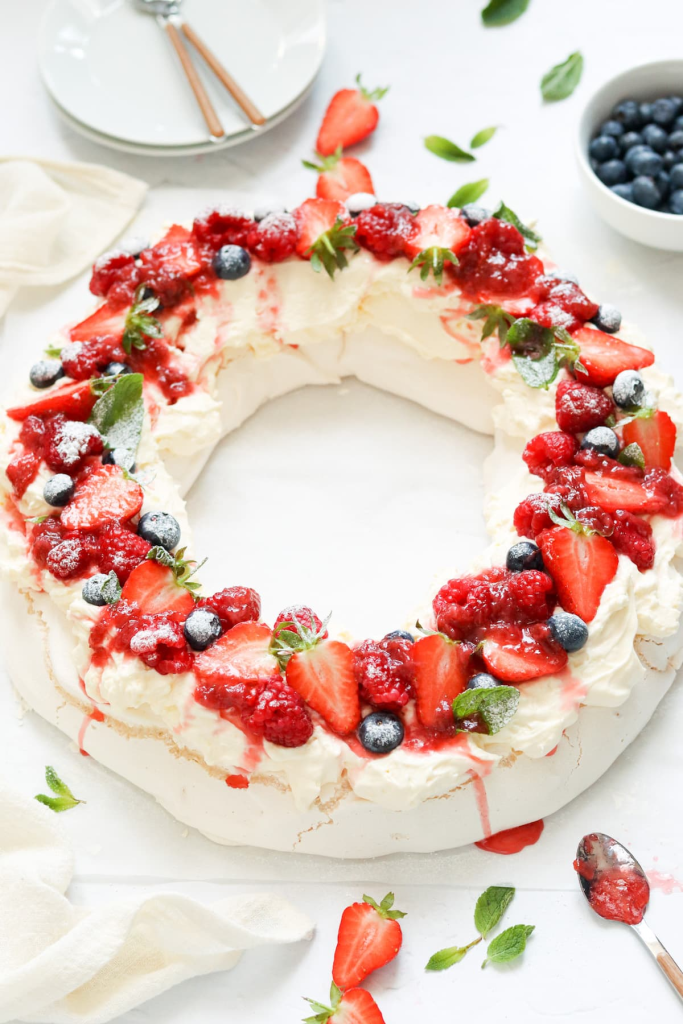 This recipe makes a very large pavlova. You could also make two smaller meringues, or make mini wreaths and serve individual pavlovas.