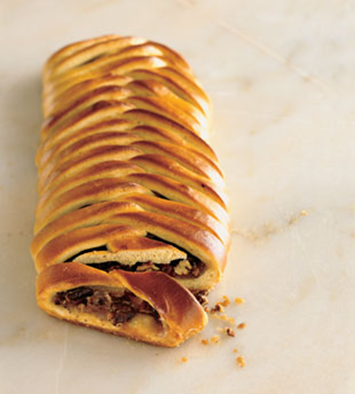 Cut unfilled dough on either side of filling into 3/4-inch-wide diagonal strips. Fold alternating strips over filling on slight diagonal, forming lattice top.