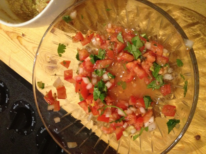 Chop the tomatoes and onion to ¼ to ½ inch dice. Too small gets mushy.