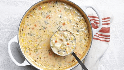 - Add the cream: When the blended chowder is back in the pot, stir in the corn and poblano pieces and bring the soup back up to a simmer. Stir in the heavy cream and shredded cheese.
