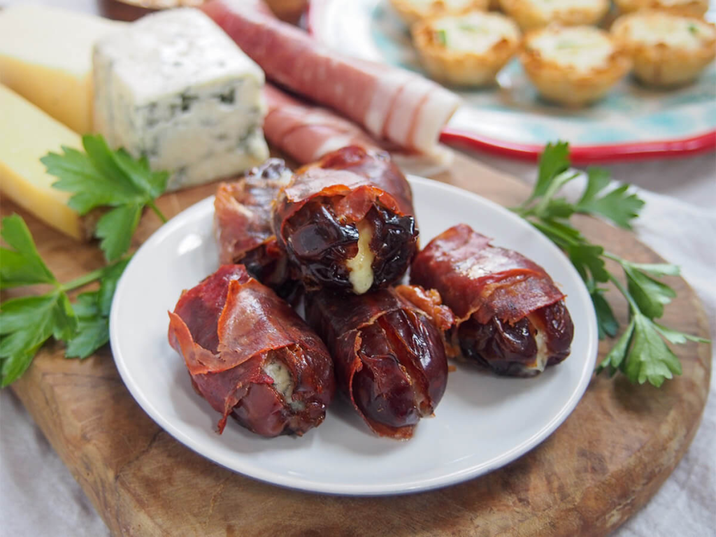 Bake dates uncovered until prosciutto is crisp and bottoms of dates caramelize, about 20 minutes.