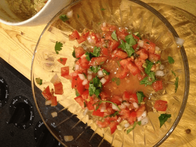 Chop the tomatoes and onion to ¼ to ½ inch dice. Too small gets mushy.