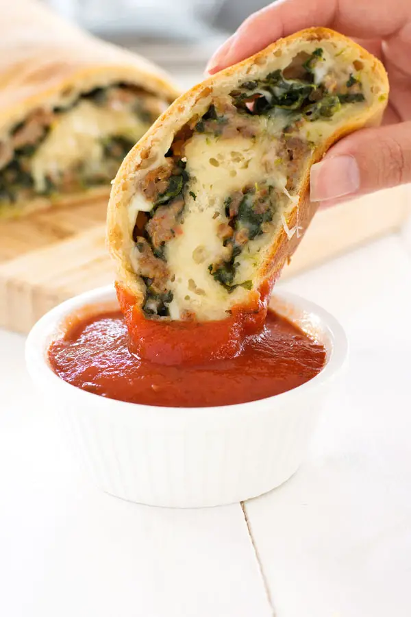 Spread 1/4 of the sausage spinach mixture on each piece to about 1/2” of the edges