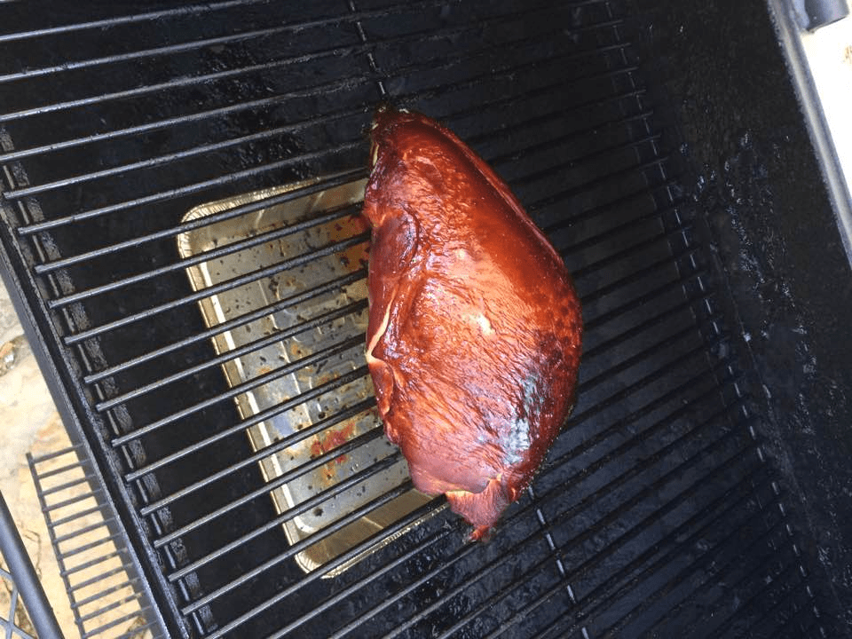 Adjust the bottom vents to maintain a temperature of 235-250F measured at the lid. Cook the turkey until it measures 160-165°F.