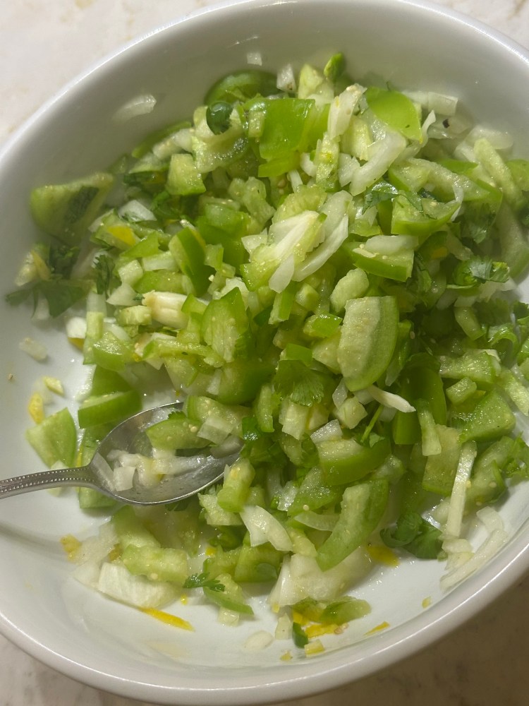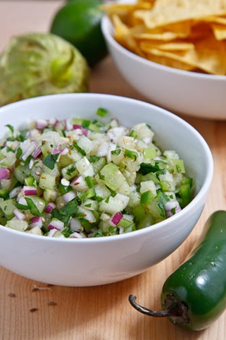 Chop the tomatillos and onion to ¼ to ½ inch dice. Too small gets mushy.